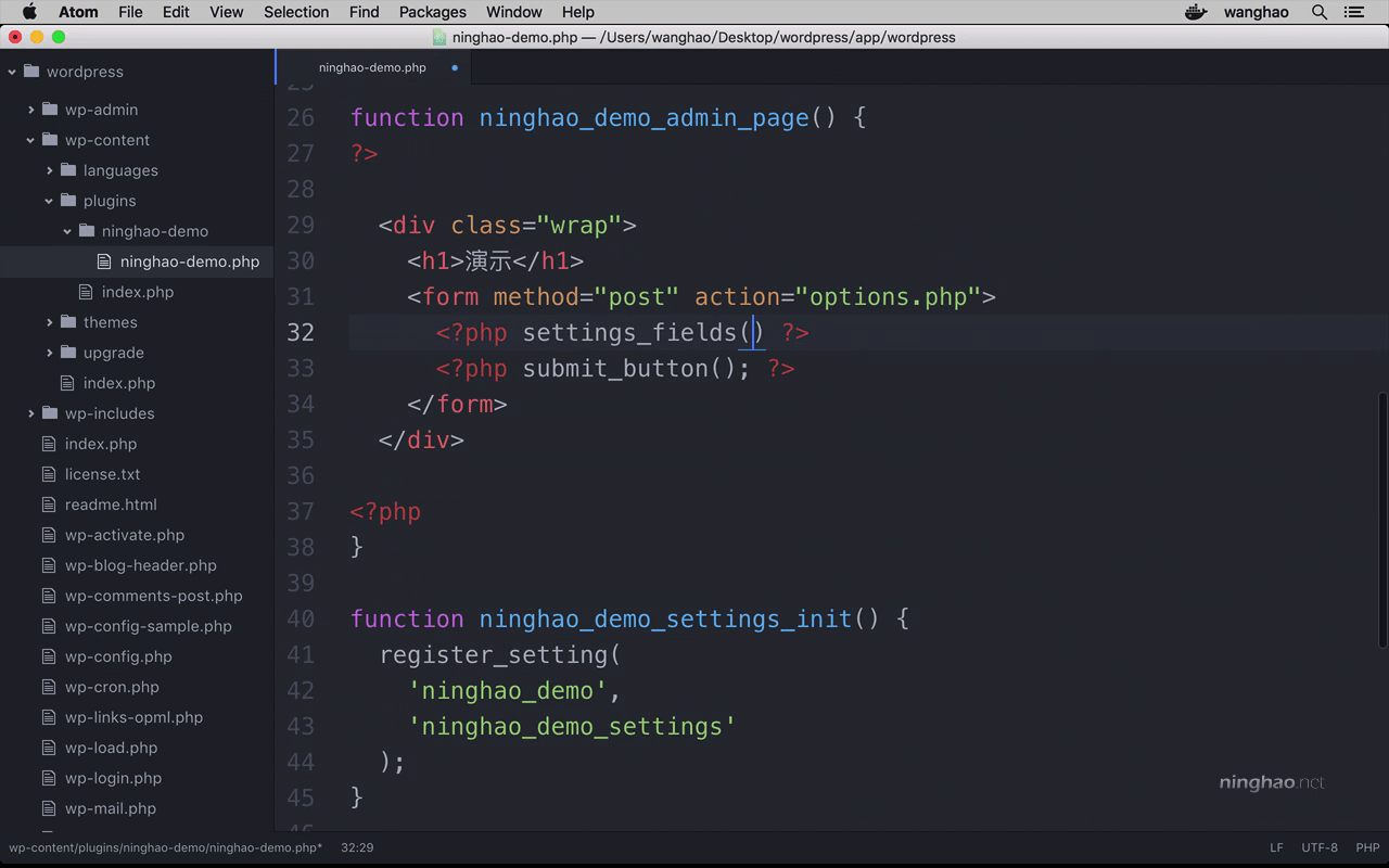 在这个配置界面的表单上,我们可以再去设置一下 ... 用一个 settings_fields ... 然后把我们注册的设置的名字告诉它 ... 就是 register_setting 的第一个参数 .. 这里就是 ninghao_demo ...