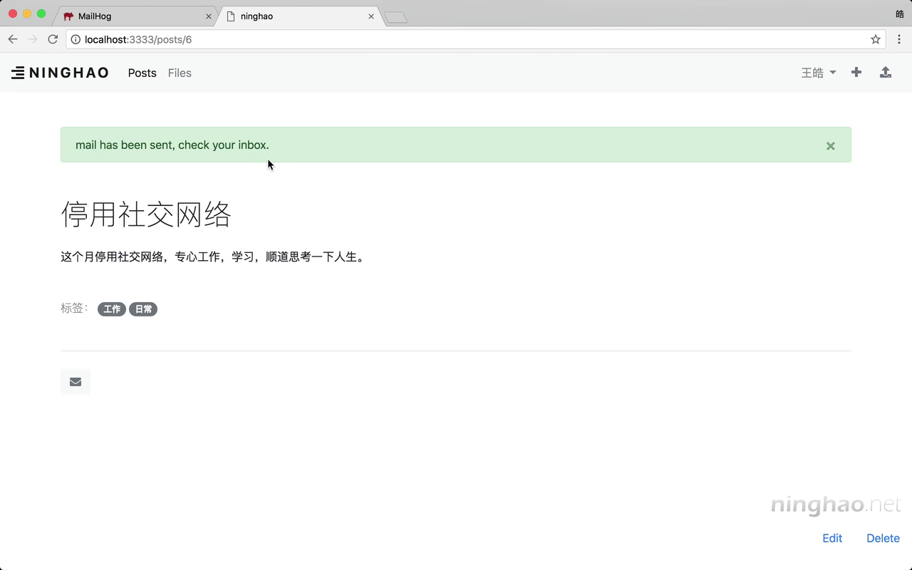 邮件发送成功的时候可以在内容页面上显示一个提示信息 .. 先回到 ShareController .. 在 email 方法里,用一下 session.flash .. type 设置成 success ... 再添加一个 message ... mail has been sent, check your indox.