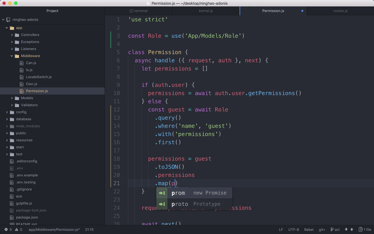 回到项目 .. 打开刚才之前创建的 Permission 这个中间件 ..