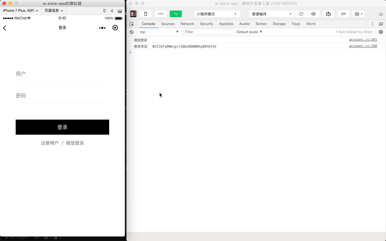 到模拟器上试一下 .. 按一下微信登录 .. 这次在控制台上输出的就是获取微信用户登录会话用的登录凭证 ..