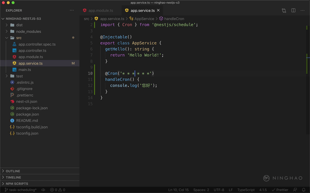 下面我们可以试一下,打开 app.service 这个服务,它是 AppModule 模块里用的一个服务。在这个服务里面添加一个方法,名字是 handelCron,这个方法就是计划任务具体要做的事情。