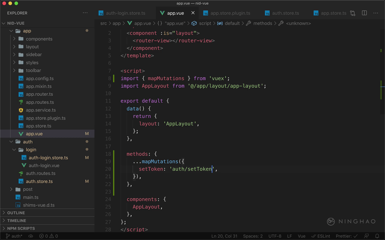 然后打开 auth-login 这个 Store 模块,找到 login 这个动作,成功获取到了数据以后可以 commit 一个 mutation,类型是 auth/setToken,值是 response.data 里的 token。